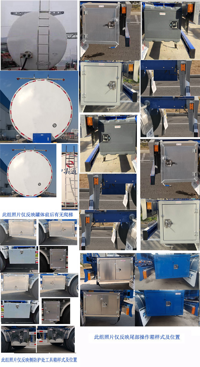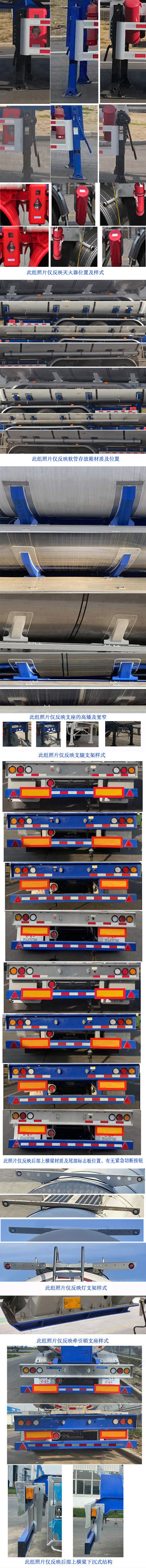 1.选装罐体前后有无爬梯,选装侧防护处工具箱样式及位置,选装尾部操作箱样式及位置. 2.选装挡泥板样式,选装侧防护结构,选装罐顶走道及集液槽样式,选装保温蒙皮及收紧带样式,选装穿线管结构,选装安全告示牌,选装后部结构. 3.选装灭火器位置及样式,选装软管存放箱材质及位置,选装支座高矮及宽窄,选装支腿支架样式,选装后部上横梁材质及尾部标志板位置、有无紧急切断按钮,选装罐顶灯支架样式,选装牵引销支座样式,选装后部上横梁下沉式结构. 4.车长11670轴距6000+1310+1310,前悬/后悬1450/1600,半挂车前回转半径(mm)1590,与半挂车匹配的半挂牵引车后回转半径(≤mm)2280,与半挂车匹配的半挂牵引车前回转半径(≥mm)1670,半挂车间隙半径(mm)2380,距离牵引销座板离地高度(mm)1210,牵引销中心轴线到半挂车最后端水平距离10220. 5. 车长11670轴距5700+1310+1310,前悬/后悬1450/1900,半挂车前回转半径(mm)1590,与半挂车匹配的半挂牵引车后回转半径(≤mm)2280,与半挂车匹配的半挂牵引车前回转半径(≥mm)1670,半挂车间隙半径(mm)2380,距离牵引销座板离地高度(mm)1210,牵引销中心轴线到半挂车最后端水平距离10220. 6. 车长11550轴距5800+1310+1310,前悬/后悬1600/1530,半挂车前回转半径(mm)1710,与半挂车匹配的半挂牵引车后回转半径(≤mm)2290,与半挂车匹配的半挂牵引车前回转半径(≥mm)1790,半挂车间隙半径(mm)2390,距离牵引销座板离地高度(mm)1210,牵引销中心轴线到半挂车最后端水平距离9950.\ 7.车轴型号FP24,FP26对应的制动衬片D20,制动鼓H32,制动蹄型号D26和ABS控制器型号VIE ABS-Ⅱ。 车轴型号10010,10110对应的制动衬片φ420*200,制动鼓SN4220,制动蹄型号SN4220和ABS控制器型号4005000810。 |