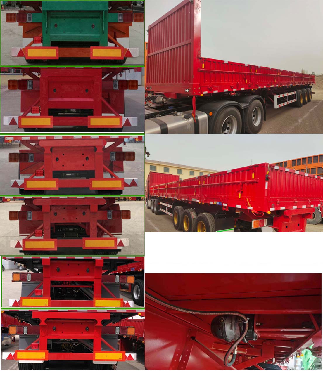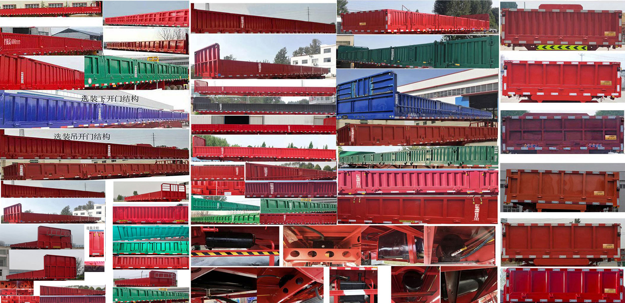 该车卸货方式为侧卸;选装前挡板样式,选装侧面栏板样式,选装吊开门,下开门,对开门,气动开门;整车栏板选装竖瓦楞,横瓦楞,方管十字花样式,选装侧面4开门,5开门,6开门;选装对开门外置锁杆样式,选装侧面合页样式;选装下开立柱样式,选装后门样式,选装液压油箱为方形或圆形,选装液压油箱位置,选装大梁异形孔. 1.外廓尺寸长/货箱内长/外廓尺寸宽/牵引销至车辆最前端的距离/轴距/后悬/牵引销到车辆最后段距离/前回转半径的对应关系(mm): 13000/12850/2550/1200/6880+1310+1310/2300/11800/1751(1733,车宽为2500), 13000/12850/2550/1300/6780+1310+1310/2300/11700/1821(1803,车宽为2500), 13000/12850/2550/1400/6680+1310+1310/2300/11600/1894(1877,车宽为2500), 13000/12850/2550/1500/6580+1310+1310/2300/11500/1969(1953,车宽为2500), 12500/12350/2550/1300/6480+1310+1310/2100/11200/1821(1803,车宽为2500), 12000/11850/2550/1300/6280+1310+1310/1800/10700/1821(1803,车宽为2500). 2.整备质量(kg)与额定载质量(kg)对应关系为:8200/31800,8500/31500,8800/31200,9000/31000 |