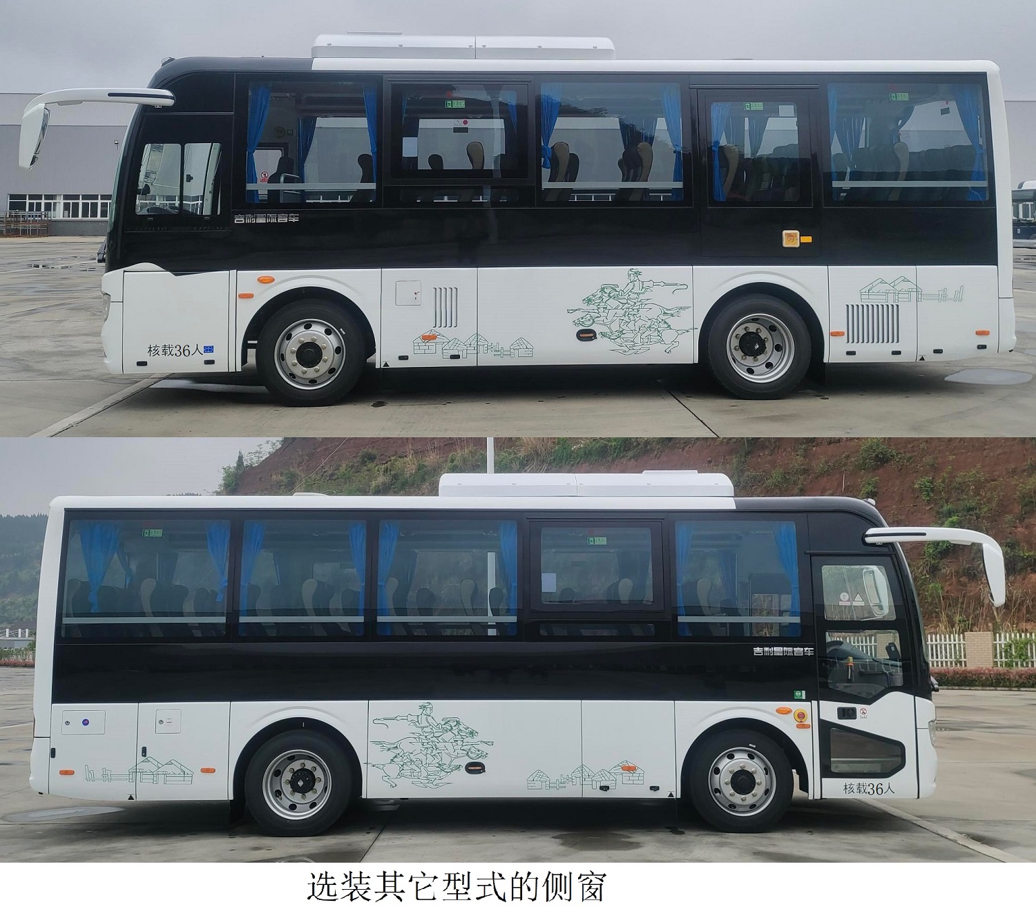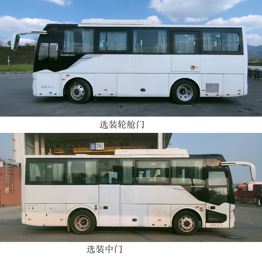 | 备注 | 1.选装标配时整备质量为8400kg,高配时整备质量为8800kg;选装轮舱门,车宽为2480mm或2510mm;最高车速为100km/h或90km/h;2.①该车右侧仅安装前门时,安全出口共计8个,其中:2个外推式应急窗、2个击碎式应急窗、1个后围击碎式应急窗、1个乘客门、1个应急门、1个安全顶窗;②该车右侧安装前/中门时,安全出口共计9个,其中:2个外推式应急窗、2个击碎式应急窗、1个后围击碎式应急窗、2个乘客门、1个应急门、1个安全顶窗;3.该车右侧安装前/中门时载客人数为24-32,右侧仅安装前门时载客人数为24-34或24-36;4.①右侧仅安装前门时,应急锤数量为7个,②右侧安装前/中门时,应急锤数量为6个;5.当载客人数为24-36时,对应空调型号为:LQK18/DBPE-E01;选装其它型式的侧窗。 | ||||||||||