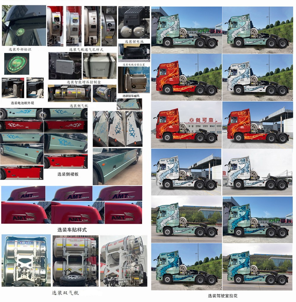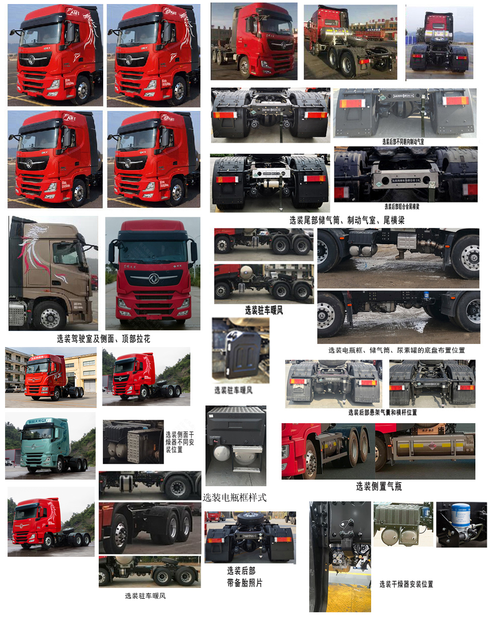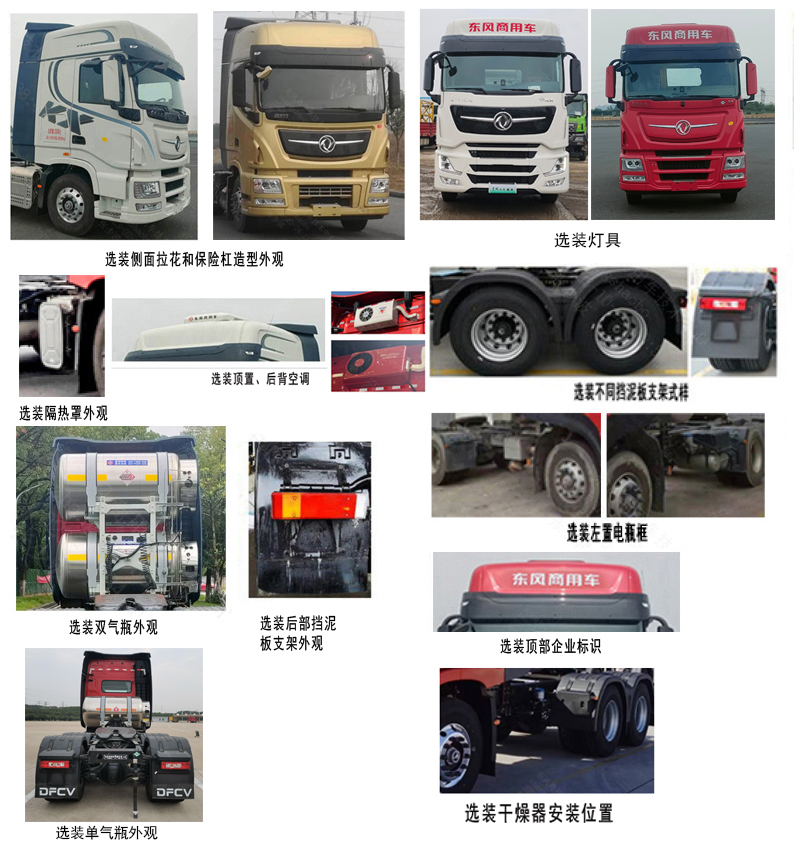 选装导流罩、选装仅不同造型灯具和不同保险杠外观的驾驶室,选装不同EGP隔热罩样式;选装顶部、侧面拉花和顶部企业标识东风商用车字样;选装后部不同挡泥板外观和支架式样;选装尾部储气筒不同布置、后部制动气室朝向、铝合金尾横梁;选装顶置或后背空调;选装电瓶安装位置、储气筒、尿素罐的底盘布置位置;选装干燥器安装位置;选装驻车暖风;选装后部悬架气囊和横杆位置;选装后部双气瓶,选装电瓶框样式,选装侧置气瓶;选装后部带备胎;选装外部标识、驾驶室拉花、车贴样式;选装气瓶通气口样式;选装增压器控制盒、电池框、选装锂电池;选装侧裙板。