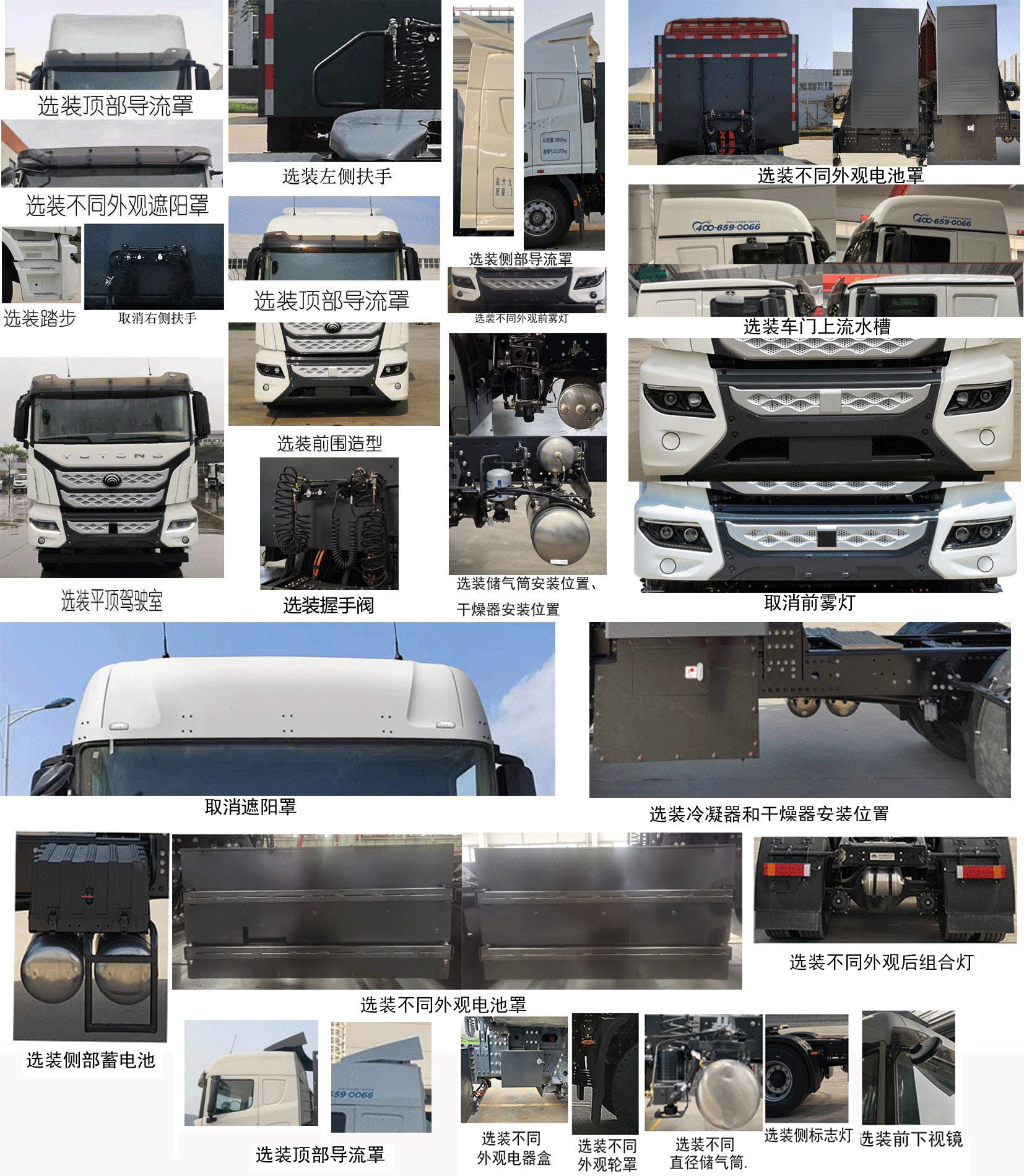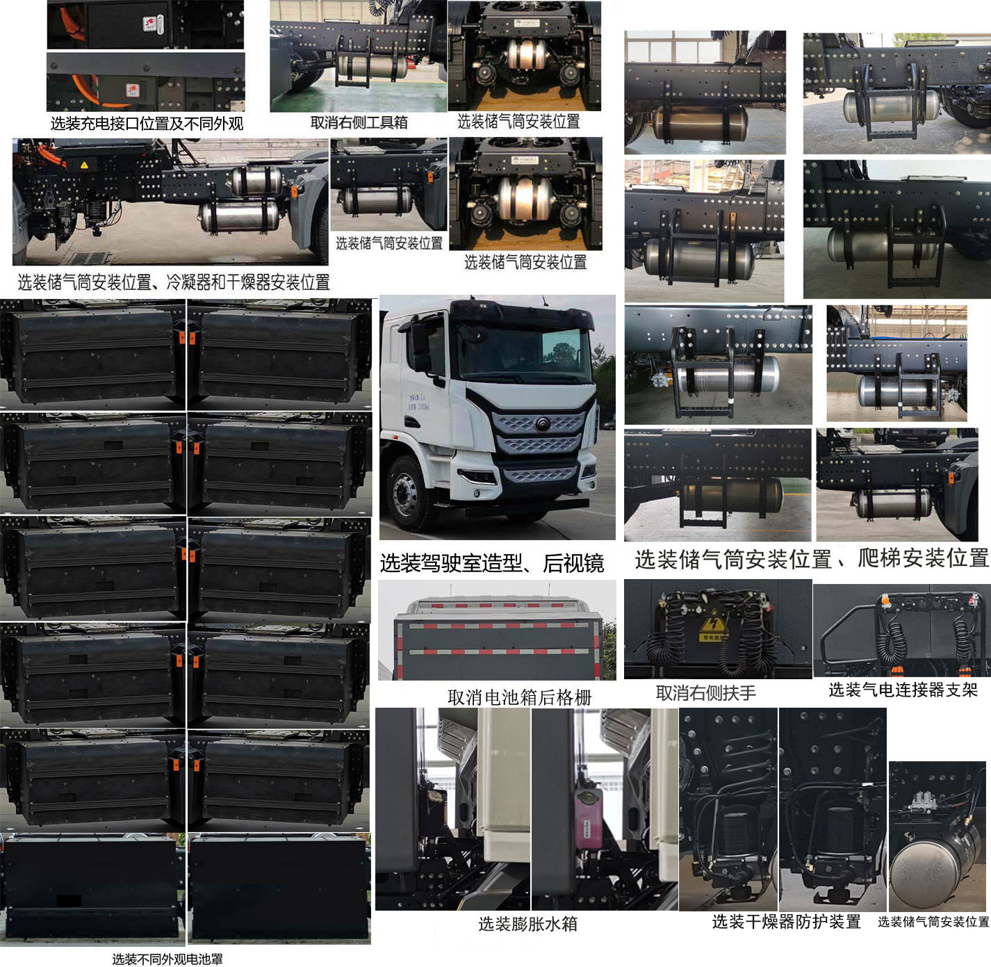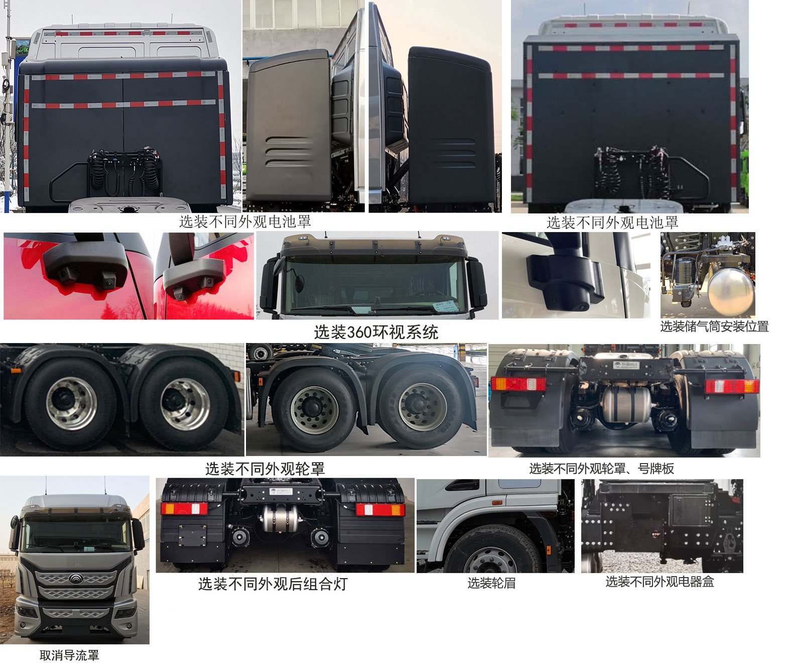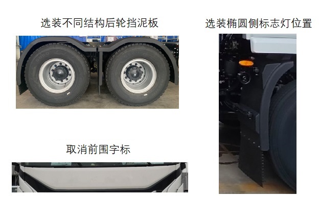 1.可选装平顶驾驶室、前围造型、踏步、不同外观遮阳罩、顶部导流罩、左侧扶手、握手阀、充电接口位置及不同外观、选装储气筒安装位置、冷凝器和干燥器安装位置、驾驶室造型、后视镜、不同外观电池罩、侧部导流罩、不同外观前雾灯、膨胀水箱、360环视系统、不同外观轮罩、不同外观后组合灯、爬梯安装位置、号牌板、轮眉、不同外观电器盒、气电连接器支架、干燥器防护装置、前下视镜、车门上流水槽、侧部蓄电池、侧标志灯、不同结构后轮挡泥板、椭圆型侧标志灯位置;可取消右侧扶手、右侧工具箱、电池箱后格栅、导流罩、前雾灯、遮阳罩、前围字母;2.整备质量(kg)/准拖挂车总质量(kg)/鞍座最大承载质量(kg)对应关系10800/38070/14070,11250/37620/13620,11500/37370/13370,10500/38370/14370;3.防抱制动装置(ABS)系统控制器型号/电子稳定性控制系统(ESC)型号/轮制动规格对应关系为:ABS型号EBS3对应ESC型号446 065对应轮制动规格φ410×180/φ410×220/φ410×220,ABS型号ABS-E 4S/4M对应ESC型号446 065对应轮制动规格φ410×180/φ410×220/φ410×220,ABS型号CM4XL-4S/4M对应ESC型号CM-ESC对应轮制动规格φ410×180/φ410×220/φ410×220、φ400×150/φ410×180/φ410×180。 |