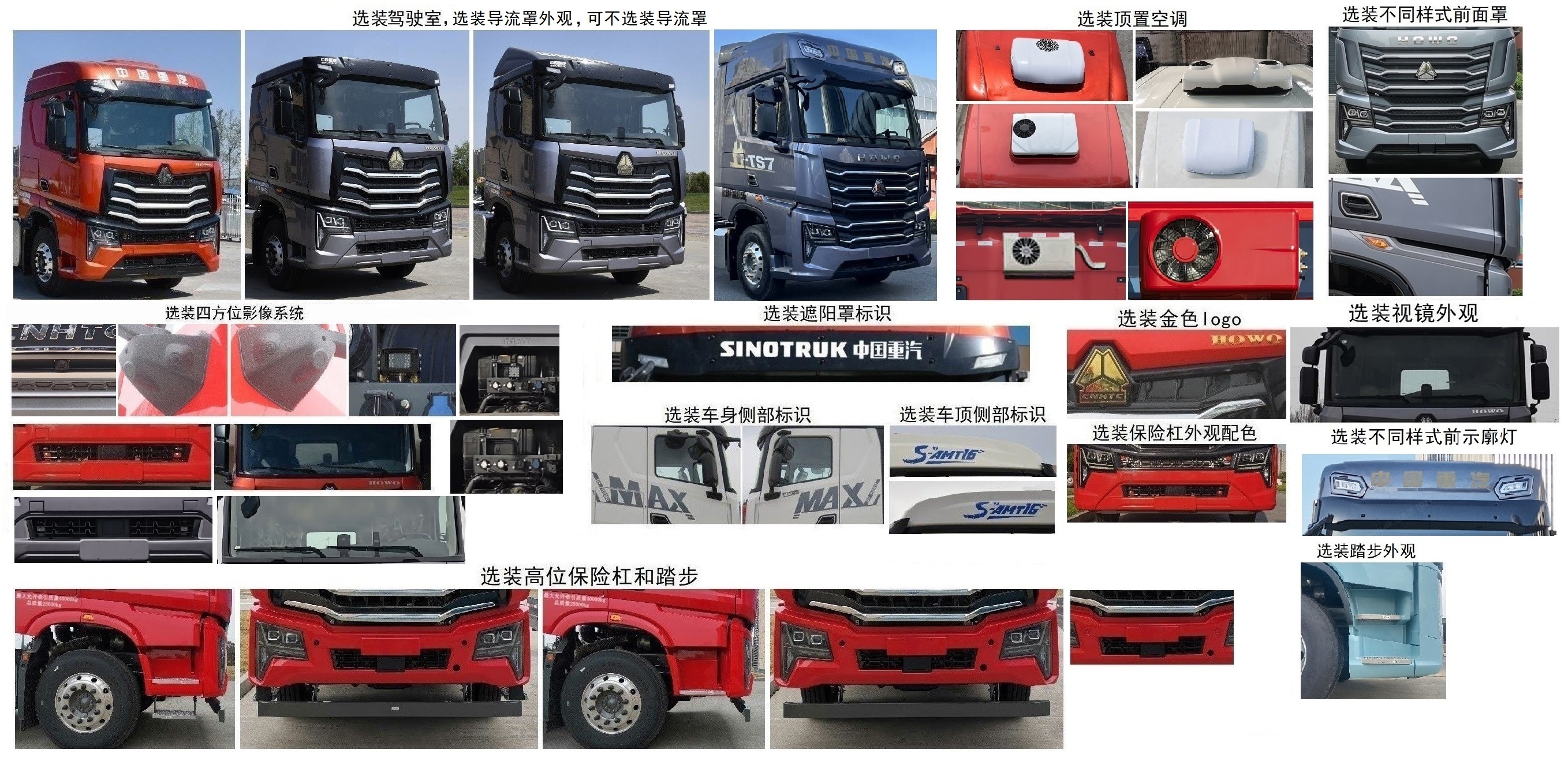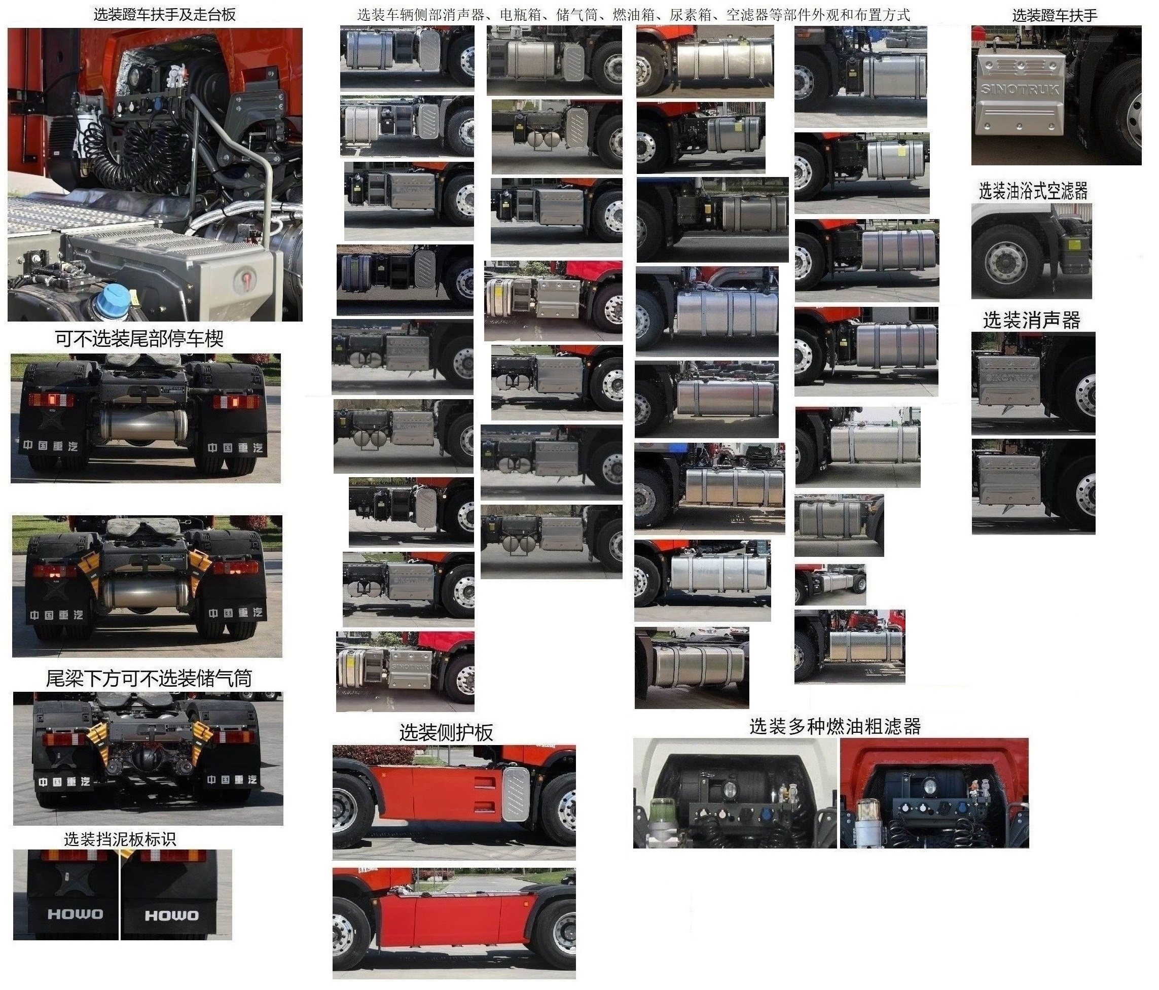 该车选装普通驾驶室,带导流罩时车高为3820mm或3900mm,不带时为3270mm或3330mm;选装高顶驾驶室,带导流罩时车高为3820mm或3950mm或3980mm,不带时为3650mm或3790mm或3820mm。选装顶置空调。选装保险杠外观配色。选装四方位影像系统。选装消声器。选装车辆侧部消声器、电瓶箱、储气筒、燃油箱、尿素箱、空滤器等部件外观和布置方式。选装油浴式空滤器。尾梁下方可不选装储气筒。可不选装尾部停车楔。选装蹬车扶手和走台板。选装金色logo。选装遮阳罩标识。选装车顶侧部标识。选装车身侧部标识。选装挡泥板标识。可选装取力器,为该车所牵引的半挂自卸液压系统提供动力配套需求。选装多种燃油粗滤器。选装车辆第3轴为可提升桥,仅允许空载状态下提升,不可牵引罐式车辆。整备质量8800kg,对应鞍座载质量16070kg,对应准拖挂车总质量40000kg;整备质量9600kg,对应鞍座载质量15270kg,对应准拖挂车总质量39200kg。安装具有卫星定位功能的行驶记录仪。选装ETC车载装置。前回转半径、牵引座中心至半挂牵引车辆最前端的距离、与半挂牵引车匹配的半挂车牵引销中心轴线到半挂车最后端水平距离的对应关系为:2500/5095/12000;2700/5295/11805。 |