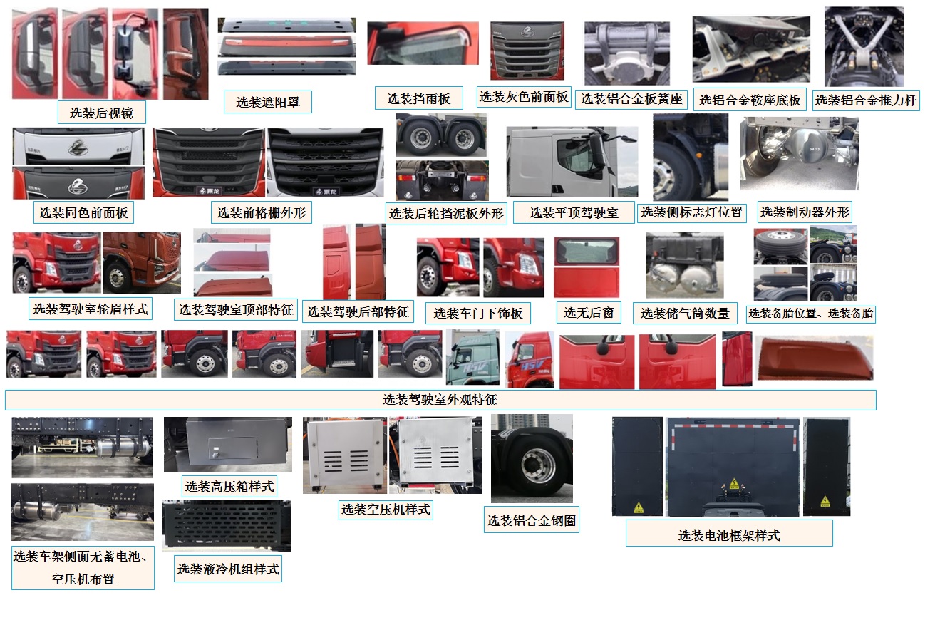 选装H7面罩.当选装高顶驾驶室时,其外廓尺寸高为3600mm,当选装平顶驾驶室时,其外廓尺寸高为3190mm.选装后视镜.选装遮阳罩.选装挡雨板.选装灰色前面板.选装同色前面板.选装前格栅外形.选装后轮挡泥板外形.选装驾驶室轮眉样式.选装驾驶室顶部特征.选装驾驶室后部特征.选装车门下饰板.选装无后窗.选装驾驶室外观特征.选装铝合金板簧座.选装铝合金鞍座底板.选装铝合金推力杆.选装铝合金钢圈.选装侧标志灯位置.选装制动器外形.选装储气筒数量.选装备胎位置,选装备胎.选装车架侧面无蓄电池,空压机布置.选装高压箱样式.选装液冷机组样式.选装空压机样式.选装电池框架样式. |