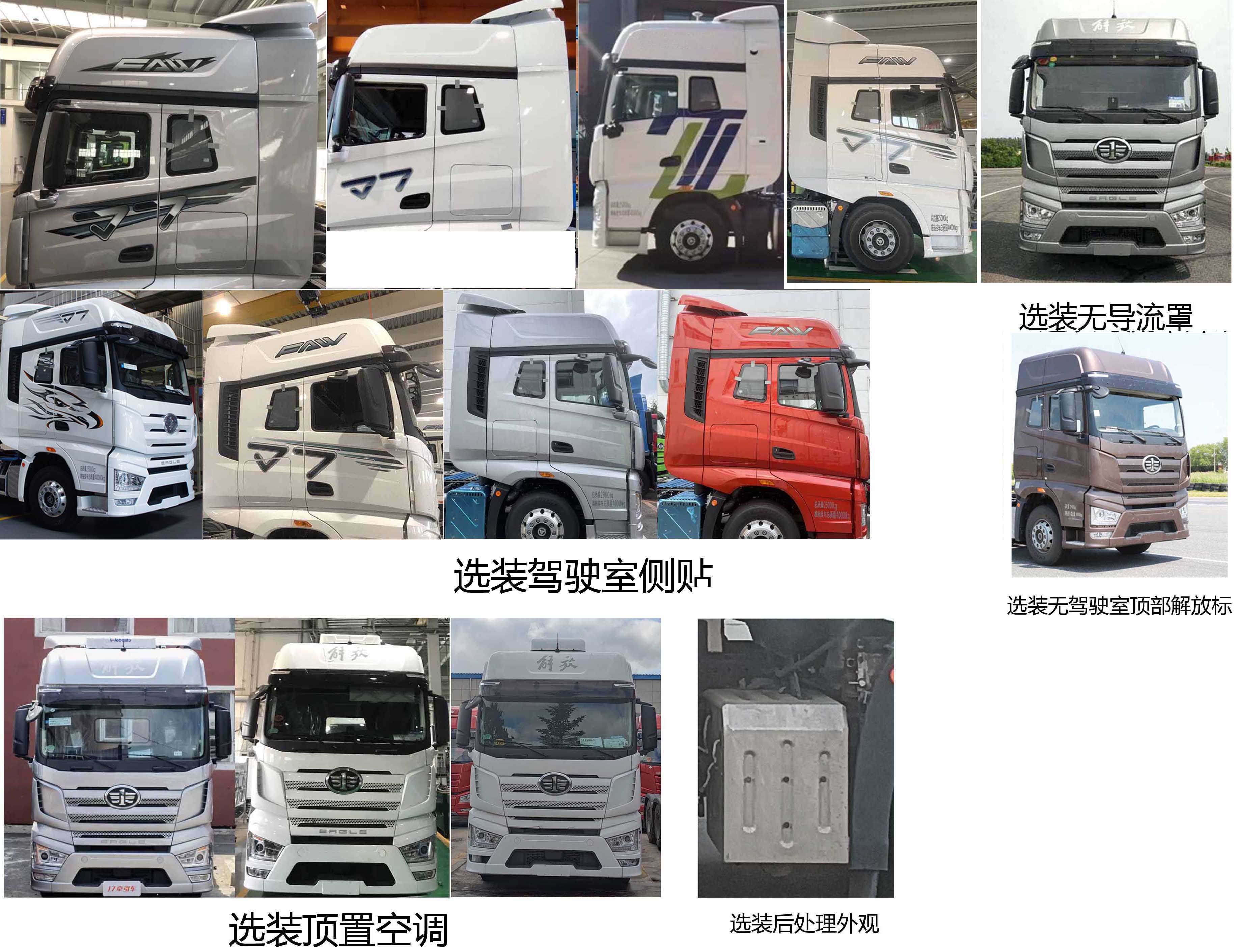 选装两根拖地带,选装导流罩,选装顶置空调,选装驾驶室喷涂,高度对应关系:高顶导流罩4000mm,无导流罩3780mm,3620mm.整备质量为7935kg,8535kg对应准乘3人,8000kg,8600kg,对应准乘2人.长度尺寸对应关系:7710=1515+5200+995,6710=1515+4200+995.轴距与牵引座中心至半挂牵引车辆后轴/轴组中心的距离对应关系:5200对应1615,4200对应625;选装后背双气瓶.车速89km/h,对应前轴鼓式后轴鼓式制动器,装备ABS,无驾驶室爆胎应急安全装置标示,无轮胎气压监测装置,对应LDWS,FCW生产企业北京经纬恒润科技有限公司,东软睿驰汽车技术(上海)有限公司,类别Ⅱ.车速120km/h对应前轴盘式后轴盘式制动器,装备EBS,对应LDWS,AEBS生产企业采埃孚(上海)管理有限公司,类别Ⅰ,装备驾驶室爆胎应急安全装置标示,装备轮胎气压监测装置. |