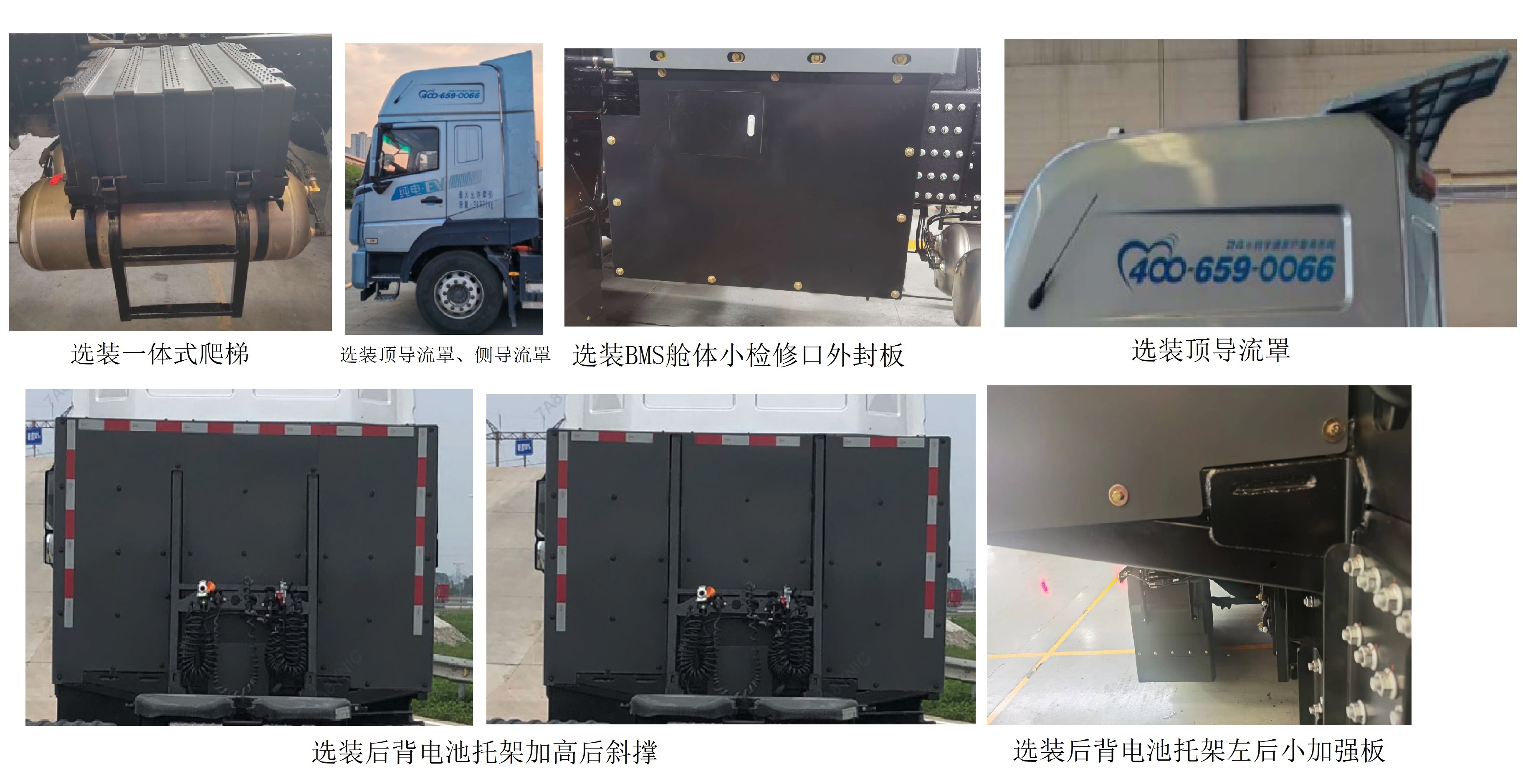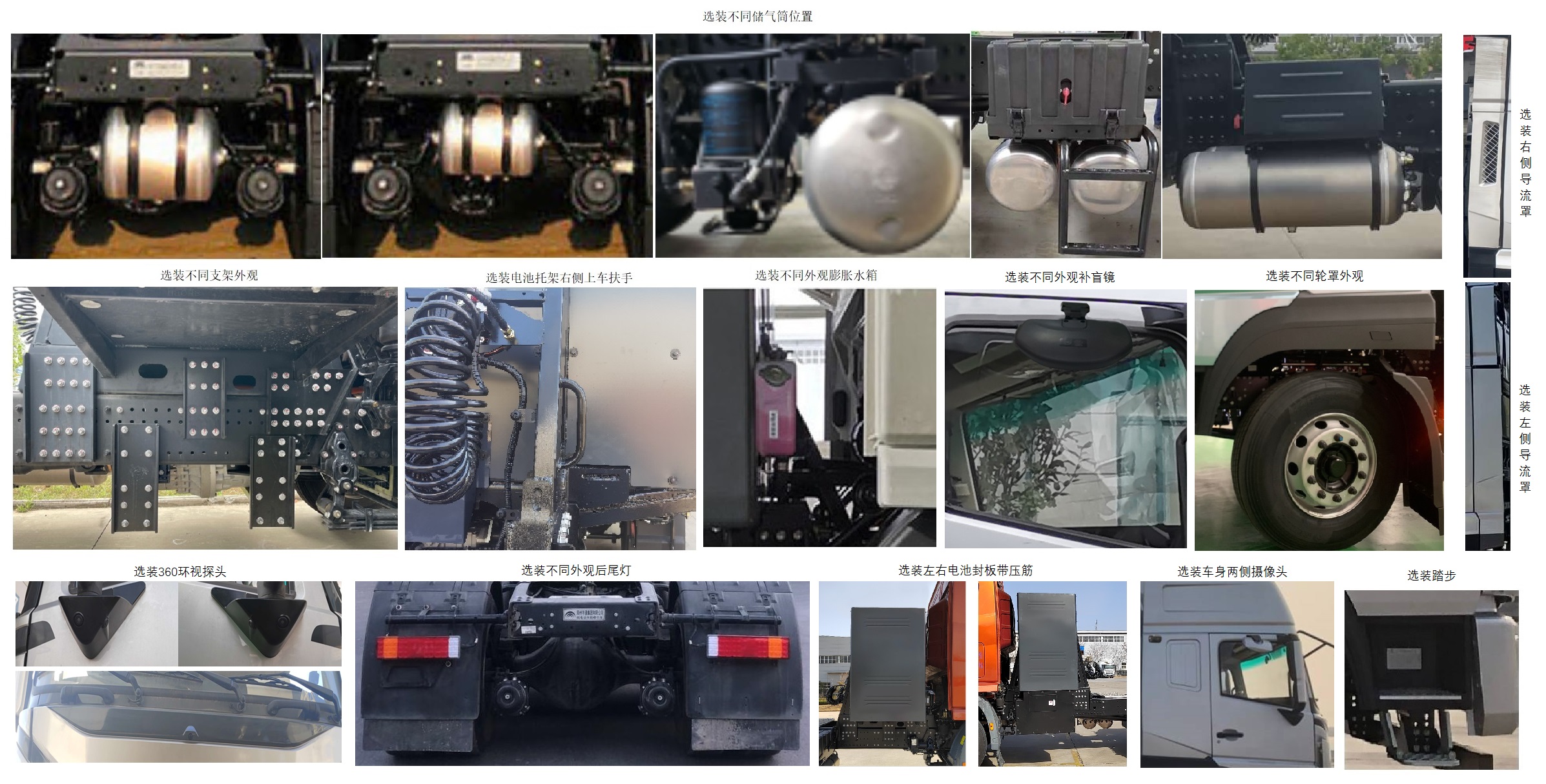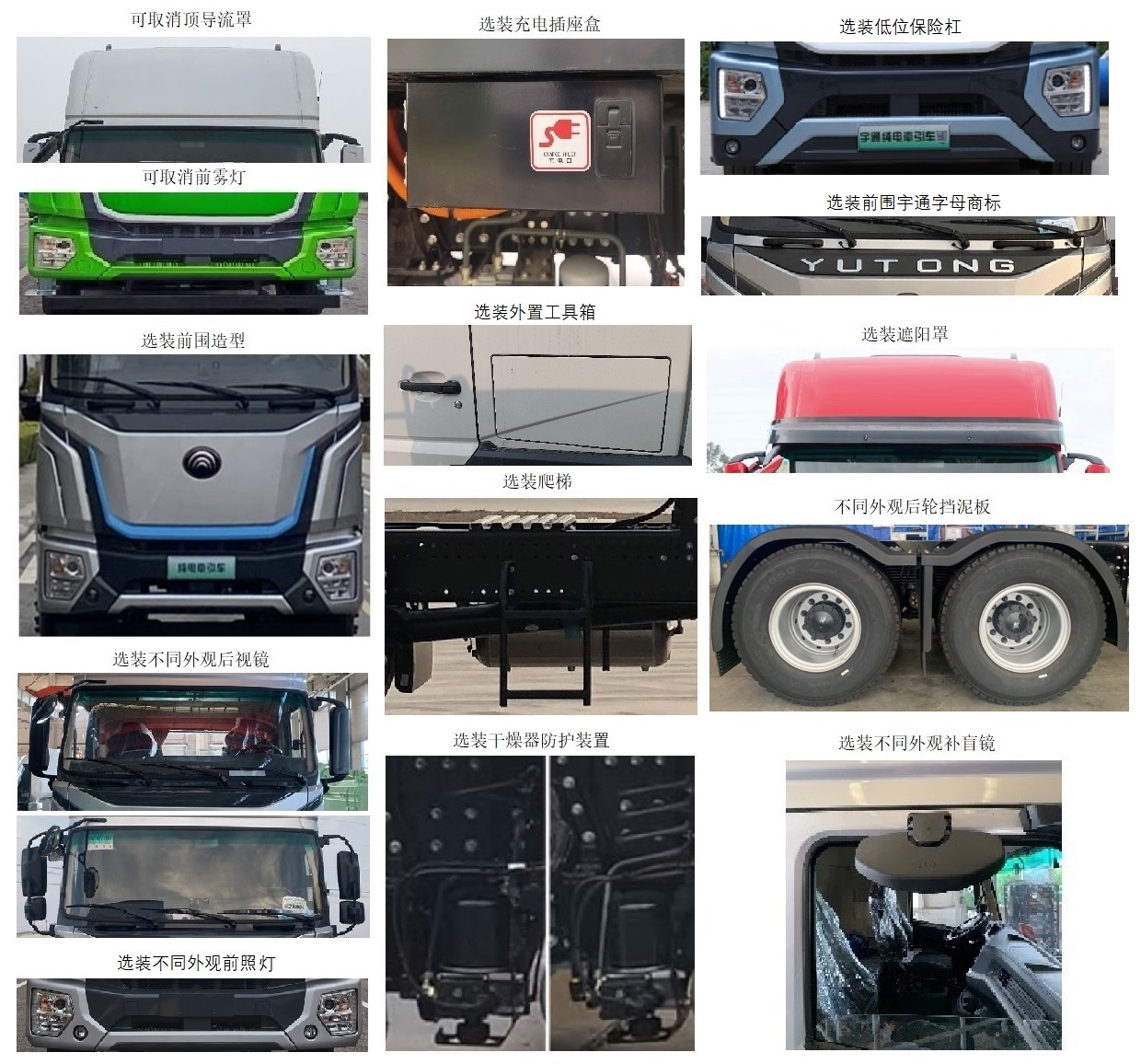 1.选装前围造型、不同外观后视镜、不同外观前照灯、充电插座盒、外置工具箱、爬梯、干燥器防护装置、低位保险杠、前围宇通字母商标、遮阳罩、不同外观后轮挡泥板、不同外观补盲镜、不同储气筒位置、不同支架外观、电池托架右侧上车扶手、不同外观膨胀水箱、不同轮罩外观、左右两侧导流罩、360环视探头、不同外观后尾灯、左右电池封板带压筋、车身两侧摄像头、踏步,可取消顶导流罩、前雾灯、选装BMS舱体小检修口外封板照片、选装后背电池托架左后小加强板、选装一体式爬梯照片、选装顶导流罩; 2.整备质量(kg)/准拖挂车总质量(kg)/鞍座最大承载质量(kg)对应关系:10200/38670/14670,10500/38370/14370,10900/37970/13970,11200/37670/13670. |