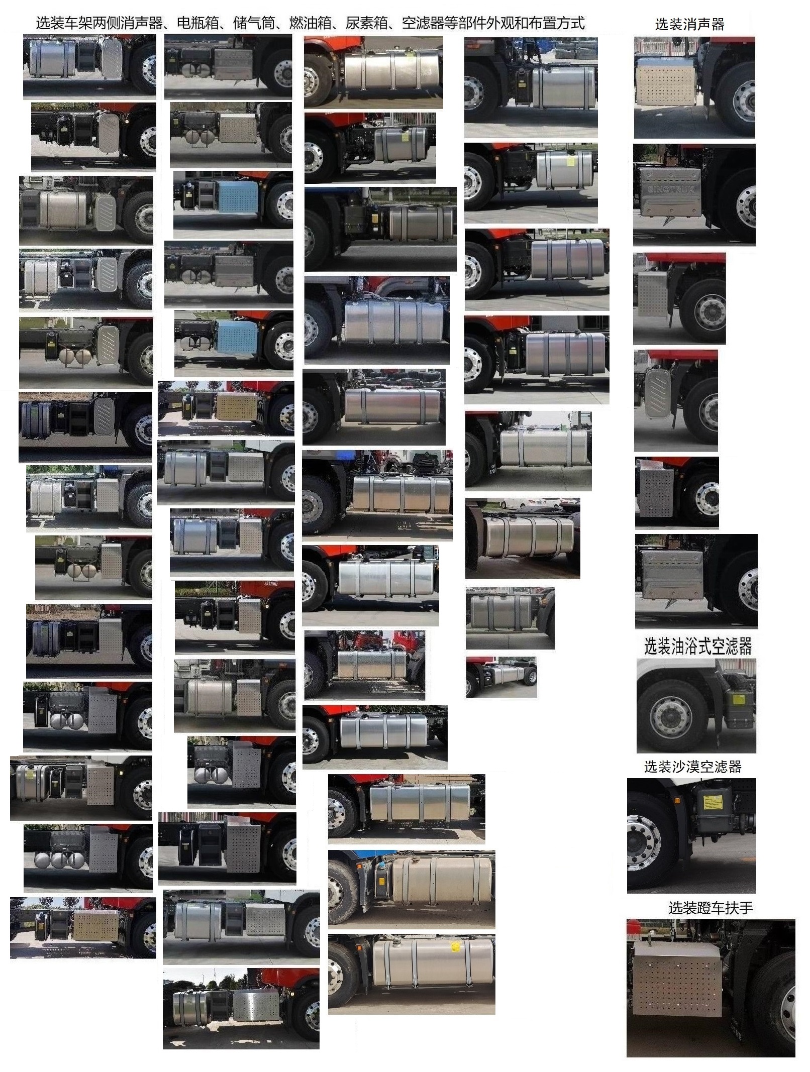 该车选装普通驾驶室,带导流罩时车高为3820mm或3900mm,不带时为3270mm或3300mm;选装高顶驾驶室,带导流罩时车高为3820mm或3950mm或3980mm,不带时为3650mm或3790mm或3820mm。选装顶置空调。选装保险杠外观配色。选装消声器。选装油浴式空滤器。尾梁下方可不选装储气筒。可不选装尾部停车楔。选装蹬车扶手和走台板。选装侧护板。车辆前部logo及饰件颜色可选择金色。选装车身侧部标识。选装车顶侧部标识。选装挡泥板标识。选装遮阳罩标识。WP7.300E61发动机对应的准拖挂车总质量为32300kg,MC07H.35-60、WP8.350E61、WP9H350E62发动机对应的准拖挂车总质量为35000kg。安装具有卫星定位功能的行驶记录仪。选装ETC车载装置。前回转半径、与半挂牵引车匹配的半挂车前回转半径(≤mm)、牵引座中心至半挂牵引车辆最前端的距离、与半挂牵引车匹配的半挂车牵引销中心轴线到半挂车最后端水平距离的对应关系为:1950/1870/4480/12000;2250/2040/4780/12000。 |