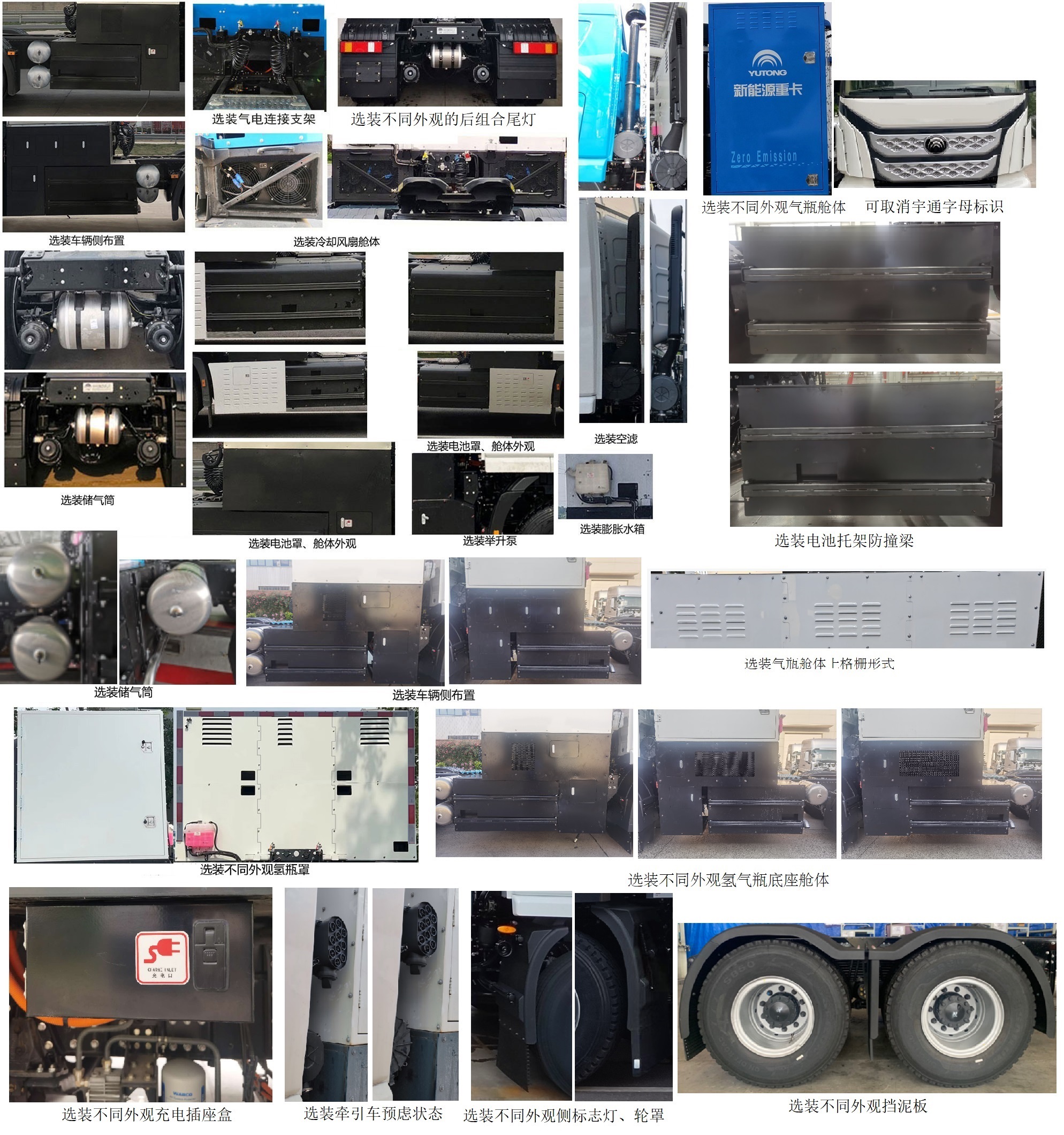 1.选装前围造型、导流罩、流水槽、360环视系统、轮眉、车门下饰板、踏步、车辆侧布置、气电连接支架、后组合灯、冷却风扇舱体、储气筒、电池罩、舱体外观、空滤、举升泵、膨胀水箱、不同外观氢瓶罩;可取消前雾灯、遮阳罩;选装气电连接支架、选装不同外观后组合灯、选装冷却风扇舱体、选装空滤、选装电池托架防撞梁、可取消宇通字母标识、选装不同外观充电插座盒、选装不同外观侧标志灯、不同外观轮罩。 2.整备质量(kg)/准拖挂车总质量(kg)/鞍座最大承载质量(kg)对应关系:11200/37670/13670,11500/37370/13370,11800/37070/13070,12300/36570/12570。 |