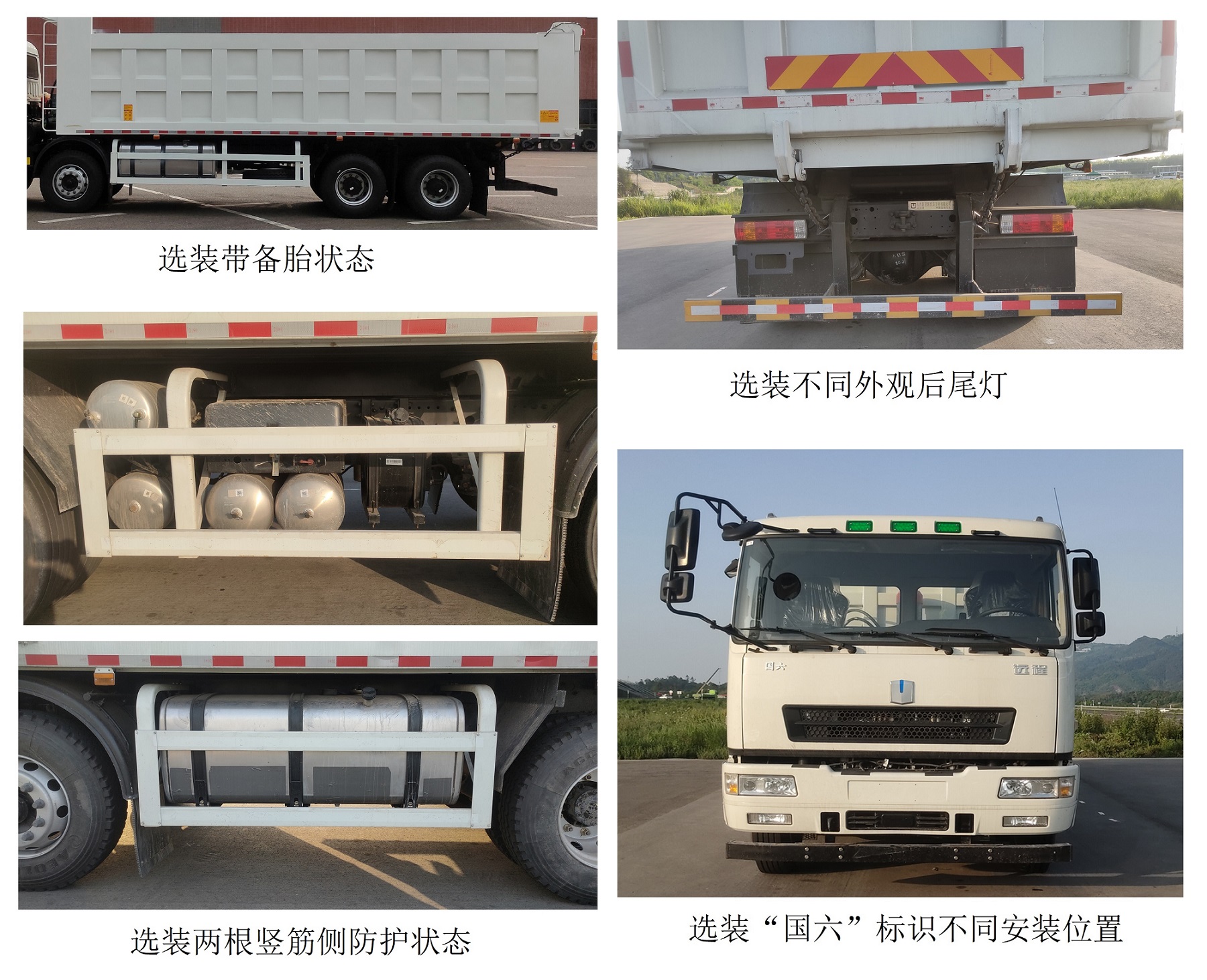 本车仅采用甲醇作为动力能源,汽油仅在低温启动时起辅助启动作用,不作为动力能源;选装“国六”标识不同安装位置,选装不同外观后尾灯,选装不同风格货箱,可选装备胎;当Ⅱ轴至Ⅲ轴距离为(mm)3200、3700时采用两根竖筋的侧防护,当Ⅱ轴至Ⅲ轴距离为(mm)4000、4605时采用三根竖筋的侧防护;整车长,货厢栏板内长,轴距,后悬的对应关系为:(1)9590,6500,1850+3200+1350,1820;(2)9740,6500,1850+3200+1350,1970;(3)9740,6800,1850+3200+1350,1970;(4)9890,6800,1850+3200+1350,2120;(5)10000,7000,1850+3700+1350,1730;(6)10150,7000,1850+3700+1350,1880;(7)10150,7200,1850+3700+1350,1880;(8)10300,7200,1850+3700+1350,2030;(9)10400,7400,1850+4000+1350,1830;(10)10550,7400,1850+4000+1350,1980;(11)10550,7600,1850+4000+1350,1980;(12)10700,7600,1850+4000+1350,2130;(13)10700,7800,1850+4000+1350,2130;(14)10850,7800,1850+4000+1350,2280;(15)11185,8000,1850+4605+1350,2010;(16)11335,8000,1850+4605+1350,2160;(17)11335,8200,1850+4605+1350,2160;(18)11485,8200,1850+4605+1350,2310. |