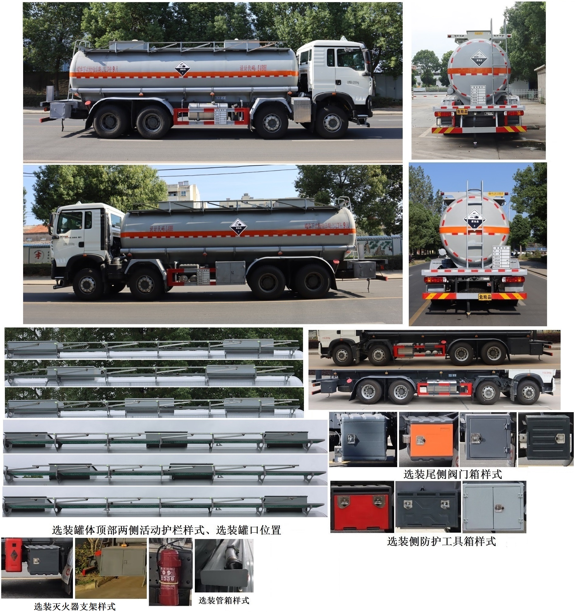 | 备注 | 随底盘选装驾驶室、选装铝合金轮毂,选装尿素箱、电瓶箱、储气筒和消声器安装位置;选装后牌照架位置.选装侧防护样式,选装罐体顶部两侧活动护栏样式、选装罐口位置,选装灭火器支架样式,选装管箱样式,选装尾侧阀门箱样式,选装侧防护工具箱样式,选装后爬梯位置.发动机型号为WP9H350E62时,整车长为:10960mm,整车高度为:3400,3435,3550mm;发动机型号为MC07H.35-60时,整车长为:11880,10960mm,整车高度为:3400,3435mm;发动机型号为MC07H.35-61时,整车长为:10960mm,整车高度为:3400,3435,3550mm. | ||||||||||