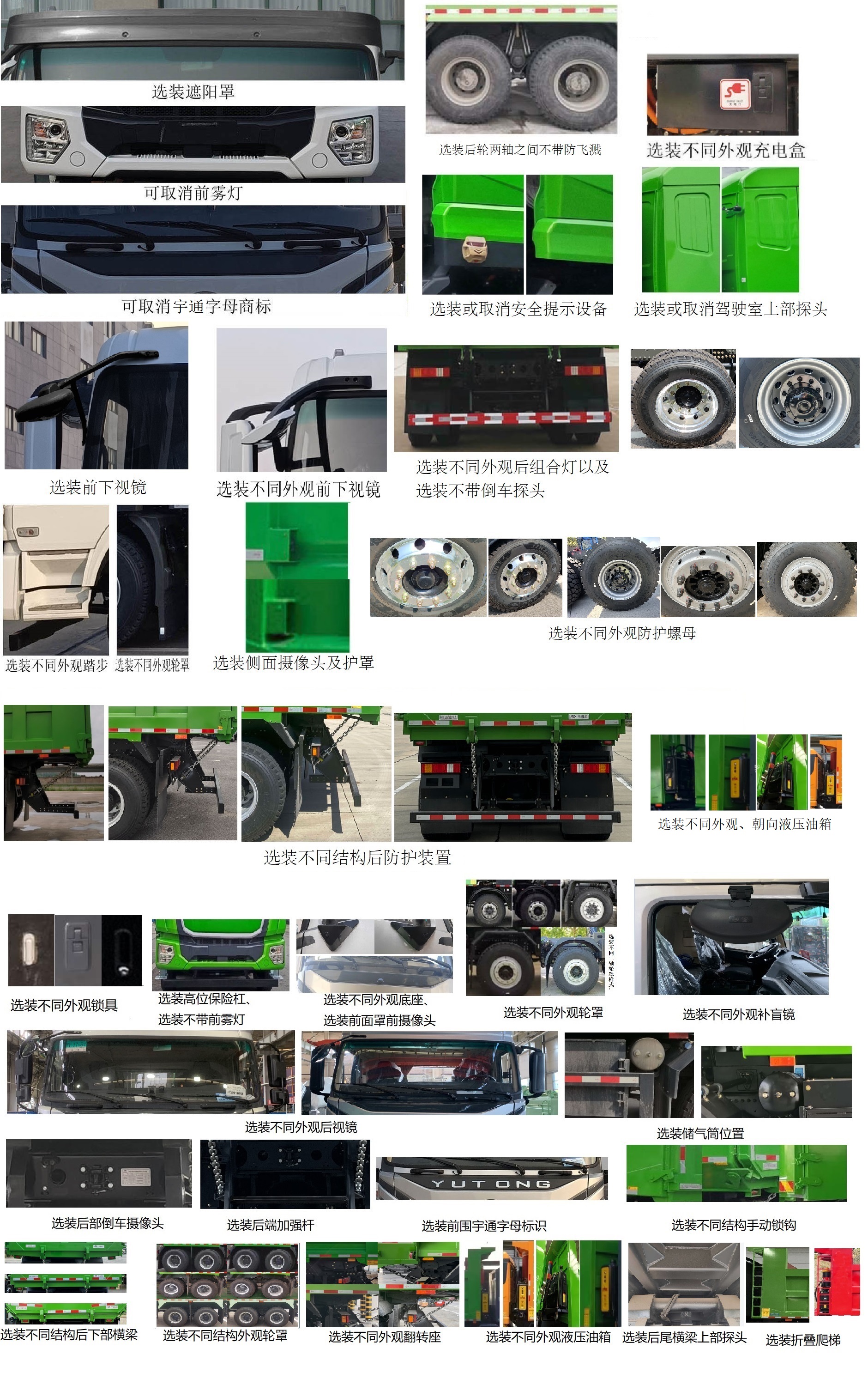 | 备注 | 1、该车装有液压举升机构,自卸方式为后卸;2、可选装不同外观车厢、不同外观环保折叠篷布或环保盖、不同外观车厢后门、遮阳罩、不同外观电池罩、不同外观充电盒、不同外观踏步、不同外观轮罩、不同外观前下视镜、声光提示设备、不同外观液压油箱、箱体后部两侧不同结构挂钩、箱体后部不同结构锁钩、不同外观后组合灯、不同结构后防护、箱体侧面摄像头防护罩、高位保险杠选装不带前雾灯状态、两侧外后视镜底座及前面罩选装摄像头、不带倒车探头、不同结构二桥轮罩、不同结构后下部横梁、不同结构手动锁钩、不同外观充电盒、选装不同外观大灯、不同外观翻转座、不同外观后视镜、侧面摄像头及护罩、储气筒位置、镀彩锌防护螺母、后端加强杆、后尾横梁上部探头、货箱侧面爬杆、折叠爬梯、前围宇通字母标识;可取消前雾灯、英文字母商标、箱体侧面摄像头防护罩、声光提示设备。 | ||||||||||