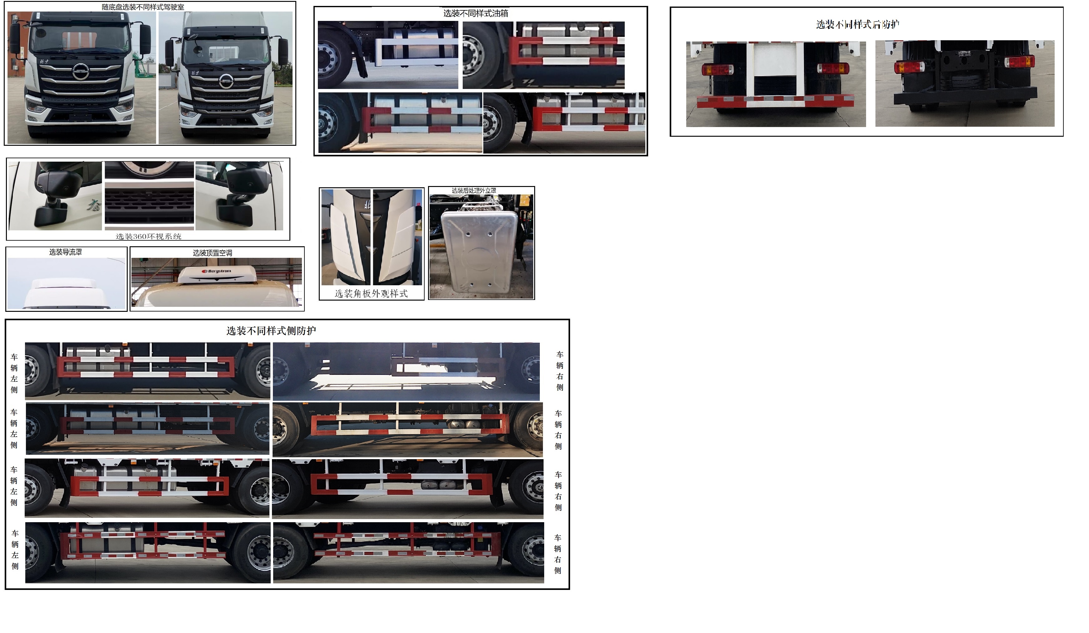 1.选装不同样式驾驶室,选装不同样式货箱,选装360环视,选装导流罩,选装顶置空调,选装角板外观样式,选装后处理罩,选装不同油箱,选装不同侧防护样式,选装不同后防护样式.2.最高车速为110km/h时:安装前后盘制动器,安装电子制动系统EBS,安装电子稳定性控制系统(ESC),安装自动紧急制动系统AEBS,安装轮胎气压监测系统;最高车速为89km/h时:安装前后鼓制动器,安装防抱制动装置(ABS),不装电子稳定性控制系统(ESC),不装自动紧急制动系统(AEBS),选装车道偏离预警系统(LDWS)和车辆前向碰撞预警系统(FCW),选装轮胎气压监测系统.3.装配AEBS时LDWS和FCW型号为ZK000001,不装AEBS时LDWS和FCW配置对应型号为LM-FLC-C2A0-019.4.仅安装盘式制动器时装配制动器衬片更换报警装置.5.外廓尺寸长/轴距/后悬/货箱长/系固点数量对应关系:12000/2100+5200/3340/9650/20,12000/2100+5200/3340/9500/20,11000/2100+4950/2590/8700/20,11000/2100+4950/2590/8600/20,10800/2100+4950/2390/8600/20,10800/2100+4950/2390/8500/20,10200/2100+4400/2340/7900/20,10200/2100+4400/2340/7800/20,9990/2100+4400/2130/7800/20,9990/2100+4400/2130/7700/20,9490/2100+4400/1630/7200/20 |