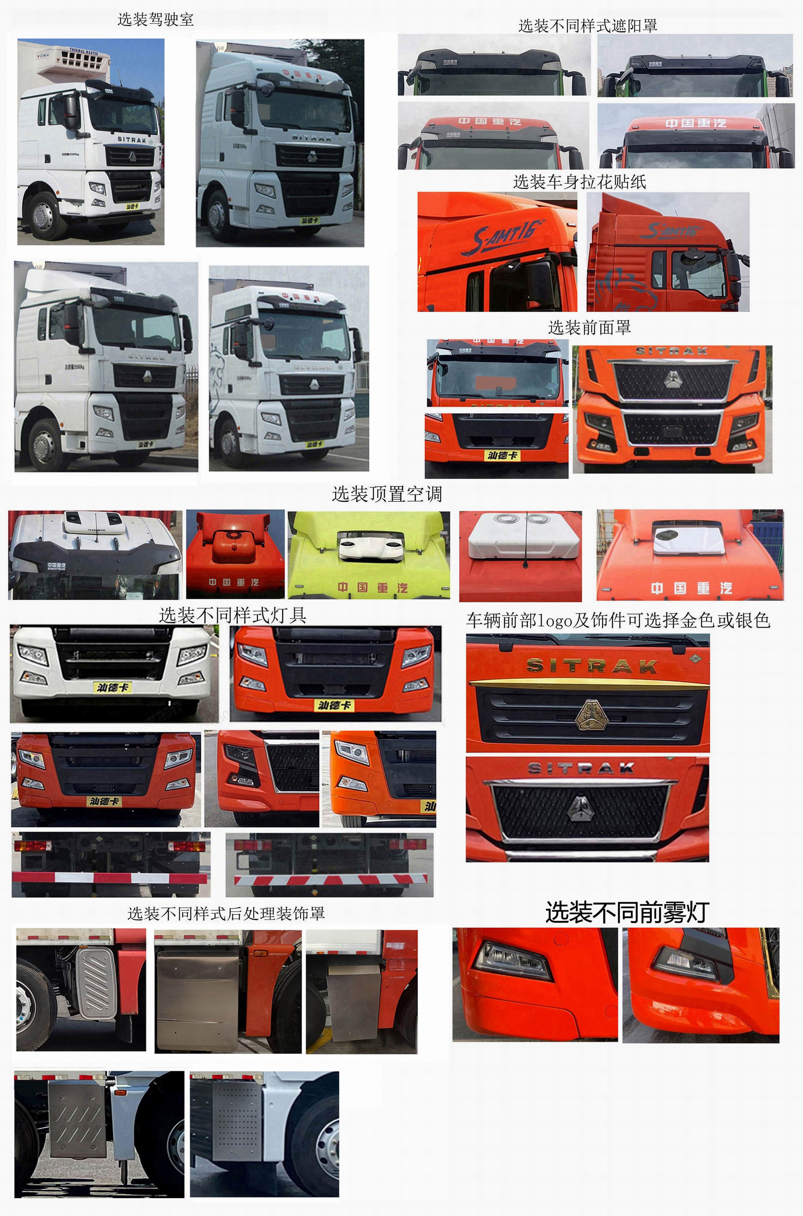 选装驾驶室。选装导流罩。选装货箱结构。选装顶置空调。可不选装驾驶室顶部天线。选装不同样式灯具。选装前面罩。车辆前部logo及饰件颜色可选择金色或银色。选装不同样式后处理装饰罩。选装不同样式遮阳罩。选装不同样式油箱。选装车架两侧消声器、电瓶箱、储气筒、燃油箱、尿素箱、空滤器部件外观和布置方式。选装车身拉花标识。车厢底板到顶棚杆的距离为2500、2600mm。 |