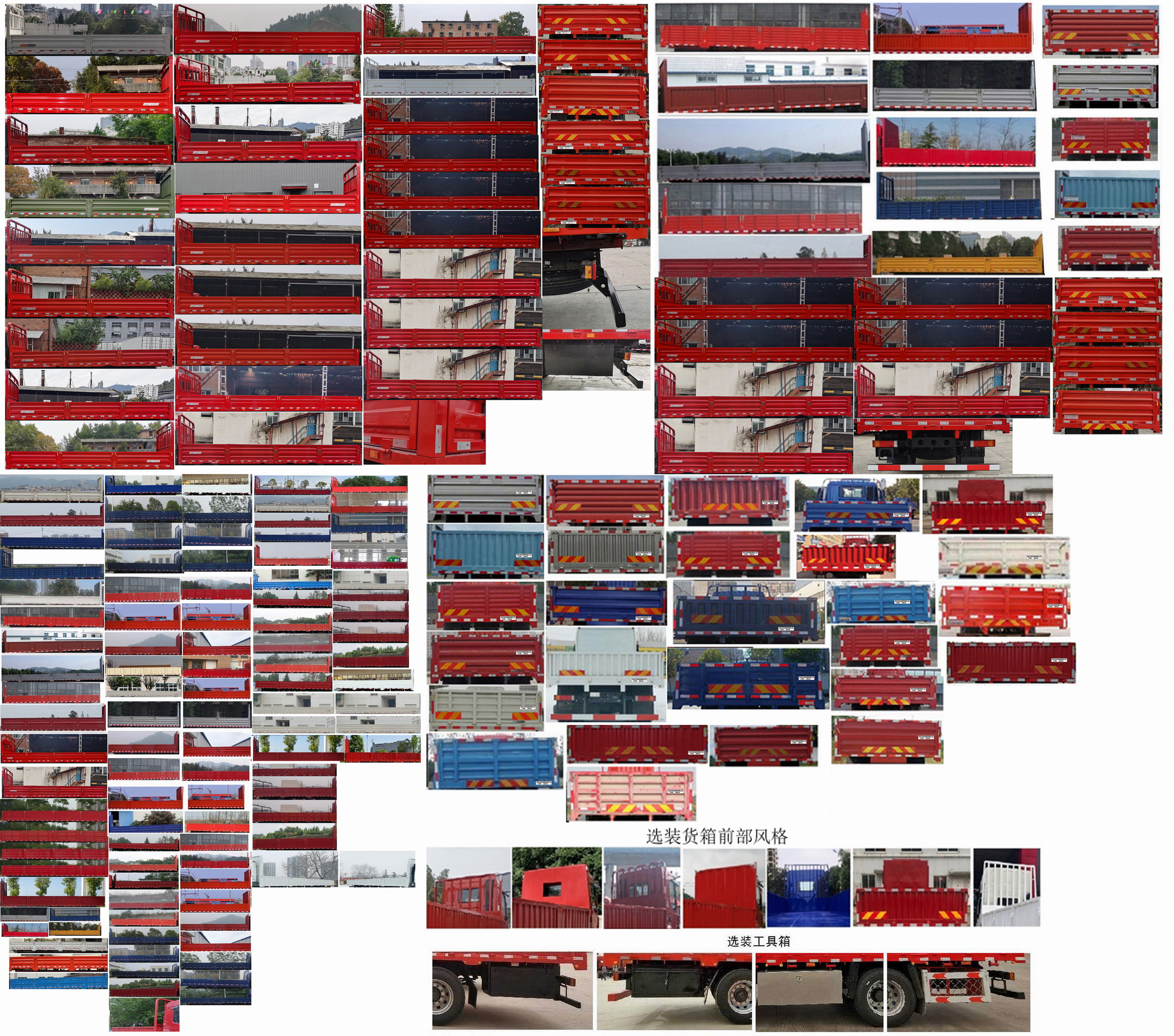 3.选装货厢形式,选装货箱前部风格,选装工具箱;随底盘选装同系列驾驶室、导流罩、遮阳罩,选装顶置气喇叭,选装空滤布置;选装油箱材质;选装油箱、尿素罐、电瓶框布置位置,选装车架尾横梁;