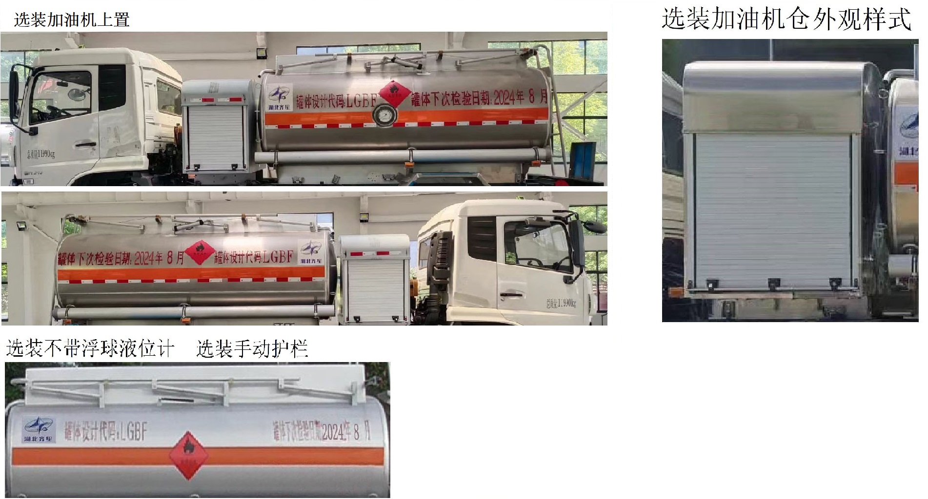 该车随底盘选装驾驶室,选装工具箱门锁外观样式,选装灭火器支架样式,选装后尾部工具箱,选装卸料软管存放箱。选装加油机上置及加油机仓外观样式,选装不带浮球液位计、选装手动护栏。 |
