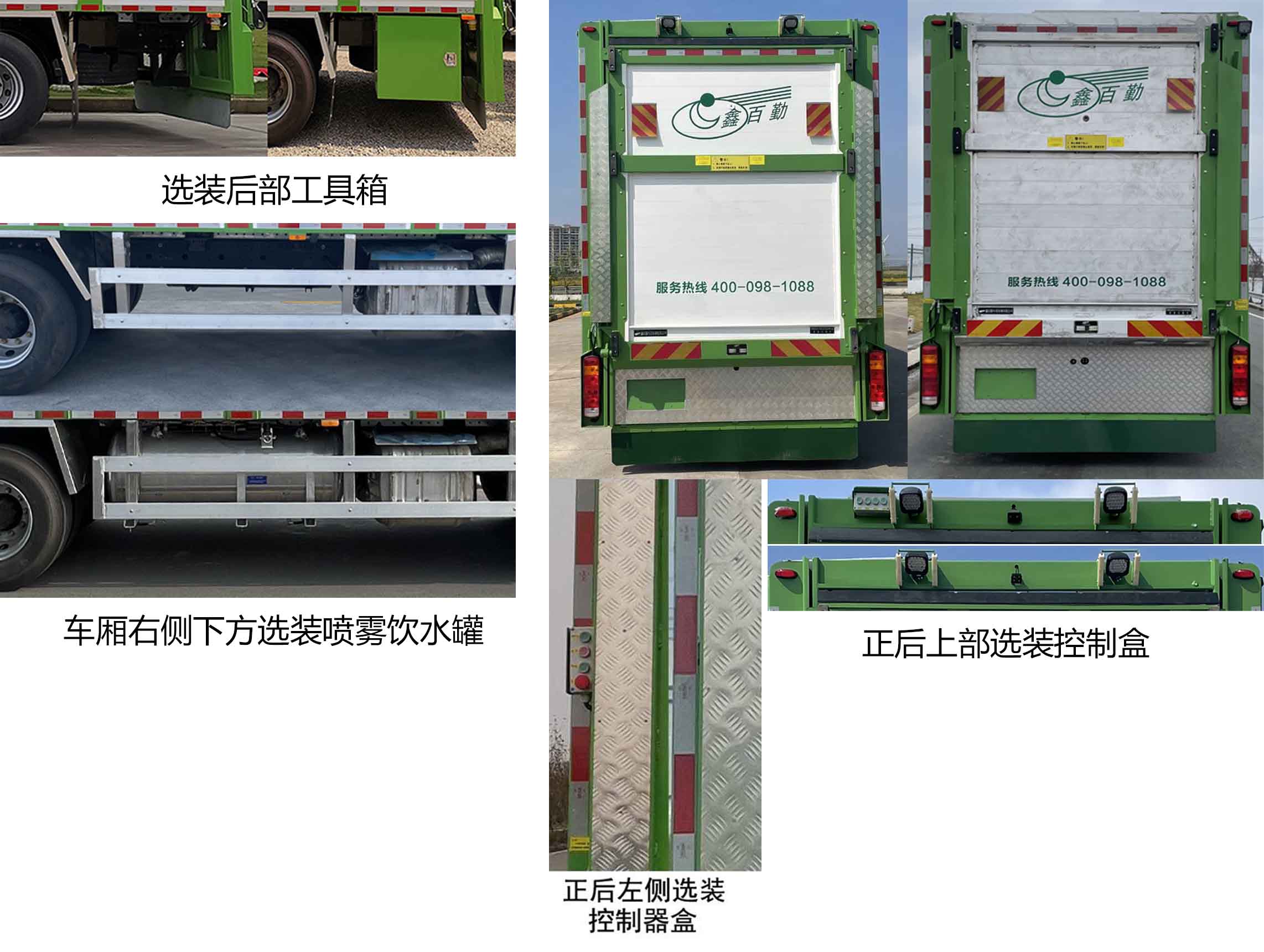 选装厢体样式,选装右侧下方喷雾饮水罐,选装左侧工具箱,选装后部控制盒,选装驾驶室标志,厢内底板到顶板最高处为2580mm,尾板质量为550kg。 |